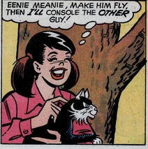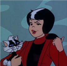 Alexandra has black hair with a white lightning-bolt shaped stripe running through the middle of it, giving her ponytail a slight impression of a skunk's tail. In contrast to the good-natured girls in the Pussycats and despite being very attractive and unbearably beautiful like them, Alexandra is cynical, hateful, cantankerous, mean, ignorant, selfish, offensive, rude, envious, scheming and self-centered. Alexandra is the mean girl in the cartoon series. She is insanely jealous of the Pussycats, especially Josie, about whom she never has a kind word. Despite having no vocal or musical talent at all, although being quite a good dancer, Alexandra desperately wants to be a star; her conditions for joining the Pussycats were that she be made the lead and that the band be renamed Alexandra's Cool Time Cats. Her absence of musical talent is on display at the end of the episode "Swap Plot Flop", when she gets the chance to front her own act; Alexander is particularly distressed by the crazy performance. Alexandra has an enormous crush on Alan M., and often tries to steal him away from Josie. In the comics, although she is not particularly fond of her brother, Alexandra often joins forces with him to separate Alan M. and Josie, which would benefit both siblings, since Alexander is interested in Josie. Alexandra's personality in the cartoon is largely unchanged. Sebastian is a tuxedo cat, and Alexandra's sidekick. In the comics, Sebastian is the reincarnation of Sebastian Cabot, a witchcraft-practicing ancestor of the Cabot family. Alexandra finds that, by holding Sebastian in her arms, she can cast powerful magic spells (Alexandra and Sebastian's bond is represented in that they both have a matching white stripe in their middle of their hair/fur). However, this plot device was seldom used and was eventually dropped. Alexandra was later shown to be able to cast spells on her own. In the cartoon, Alexandra and Sebastian do not have magic powers but they still have their white stripes. Alexandra's voice in the cartoons is provided by former Mouseketeer Sherry Alberoni, while Don Messick supplies the meows, screams, and Muttley-esque snickers for Sebastian.