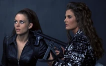 Later, she appears just in time to save Dr. Evil from being captured by Austin Powers. A revolving platform spins around to reveal Alotta holding Vanessa at gunpoint. She wears an odd blue checkered sweater and black leggings combination.