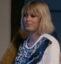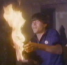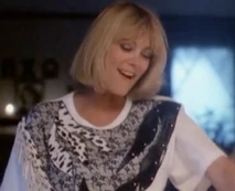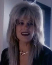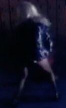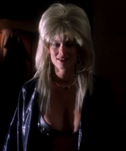 She is lured into the lockeroom by Calvin and Spider, where she has a catfight with Spider. Spider sprays her with gasoline and then Calvin throws a molotov cocktail on her. The two watch on as Babs burns to death. Afterwards, Spider says to Calvin, "It's too bad we had to kill her. I really liked the outfit she had on." And it was a very nice dominatrix outfit at that. It was very dark, and the light only allowed to grab glimpses of the entire thing. She had a leather bra that barely contained her breasts from popping out. The leather bra had metal spikes on the outside. She was wearing black silk stockings and black high heel stilettos on. Her bottom was a short dark blue leather, almost a bikini length. She was wearing a dark blue shiny silk nighty like robe, that was very thin, and almost served as a cape. And she had fishnet opera gloves on. Her punched out hair was a silvery grey and looked like she had a bad perm.