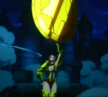 At the final battle, she wears a power-up golden armor and wields a sword created by Tesoro .