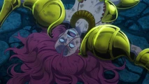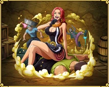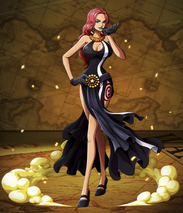 Baccarat was concierge on the Grand Tesoro, a ship and entertainment city ruled by a cruel & powerful man named Tesoro (who can manipulate gold). When the Straw Hat Pirates arrive at Gran Tesoro Baccarat acts friendly and helpful. However, she is actually manipulating them with her power to lose everything and then to be enslaved to repay their debt. The Straw Hats fought back against the Tesoro Gild, so Tesoro transformed Baccarat with gold armor, increasing her Devil Fruit power significantly. To gain more power she stole the luck of several allied minions, causing them to perish in the process. Baccarat’s new boosted power made her extremely arrogant in battle, believing her good luck will protect her from all harm. She throws her sword away to fight Brook, Chopper, and Usopp using just her Devil Fruit ability with a coin. Baccarat taunts the straw Hats, inflicting multiple painful instances of bad luck upon them, and plans to kill them in the end. Her overconfidence led to her downfall as Usopp had secretly depleted all her luck. She did not bother to avoid Usopp’s projectile explosive attack. In bewilderment how her powers could have failed as she collapsed to the ground. She has been confirmed to survive in One Piece Stampede. In One Piece Stampede, she is seen walking around with Gedatsu at the Pirates' Expo seemingly having entered a relationship with him.