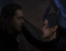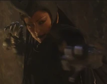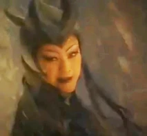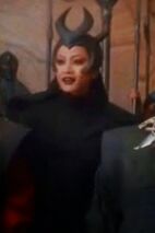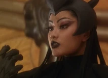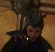 She wears black with a horned black headress and a dark cape with a spider web pattern design.