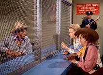 Together the pair looted Gotham City and defied all its authorities, particularly Batman (Adam West), Robin (Burt Ward), and Batgirl (Yvonne Craig). Batman deduced that Shame meant to rob the Gotham City Opera House. The caped crusader easily overpowered Shame and his men, but were surprised by Calamity Jan and Frontier Fanny, who used the gang's secret weapon, fear gas. The powerful chemical quickly reduced Batman and Robin to helpless cowards, allowing Shame's gang to escape with the loot and a captive Batgirl.