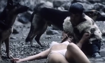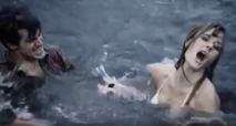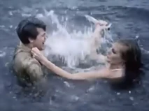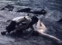 Carole spots Frank swimming in a canyon river, strips down to her underwear and jumps into a river at the bottom of a canyon to attack him in the water. She attempts to use her knife to kill him, and the two struggle for awhile. Finally Coplan is able to knock her out, and we see her floating unconscious and face down underwater. Later, her dead body is scooped up by her dwarf henchman, Le Nain (Roberto).