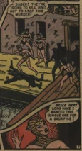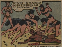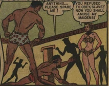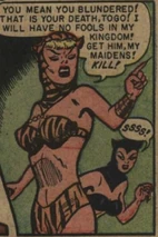 In the dead of the night, The Cat Maidens sneak into the village and captures Saber, Rulah's pet black panther. However, in the process of the raid, Rulah discovers who the captors are. As a result, the Cat Queen has her maidens kill Togo, who is responsible for the blunder.
