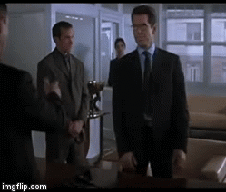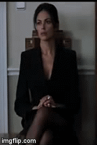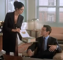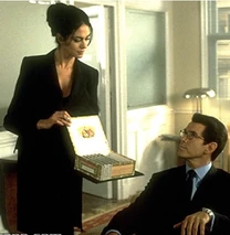 The Cigar Girl first appears entering an office in Bilbao, Spain, carrying a box of cigars. She offers a cigar to James Bond (Pierce Brosnan) and her employer, a Swiss banker, Mr. Lachaise (Patrick Malahide). Bond is there retrieving money for Sir Robert King (David Calder), a British Oil tycoon and friend of M. As she hands him a receipt for the money, she asks Bond if he would like to check her figures. Bond pauses and looks up as she is bending down. He responds, "Oh, I'm sure they are perfectly rounded." She is wearing an all black business suit type dress, with a low cut plunging top. When she is seated in a chair she shows off her very sexy nylon covered crossed legs.