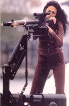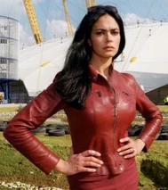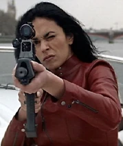 Bond returns to M16 headquarters in London, England in order to return the money to Sir Robert King. However, the money was actually a fertilizer bomb which kills King and blows a hole in the wall of the building. Through a hole in the wall, 007 spots the Cigar Girl, who is watching the building from a Sunseeker boat on the River Thames. Cigar Girl is wearing a red leather body suit with a zipper down the front. She uses a machine gun to fire at Bond and then takes off down the Thames, with Bond pursuing in a prototype Q-Boat.