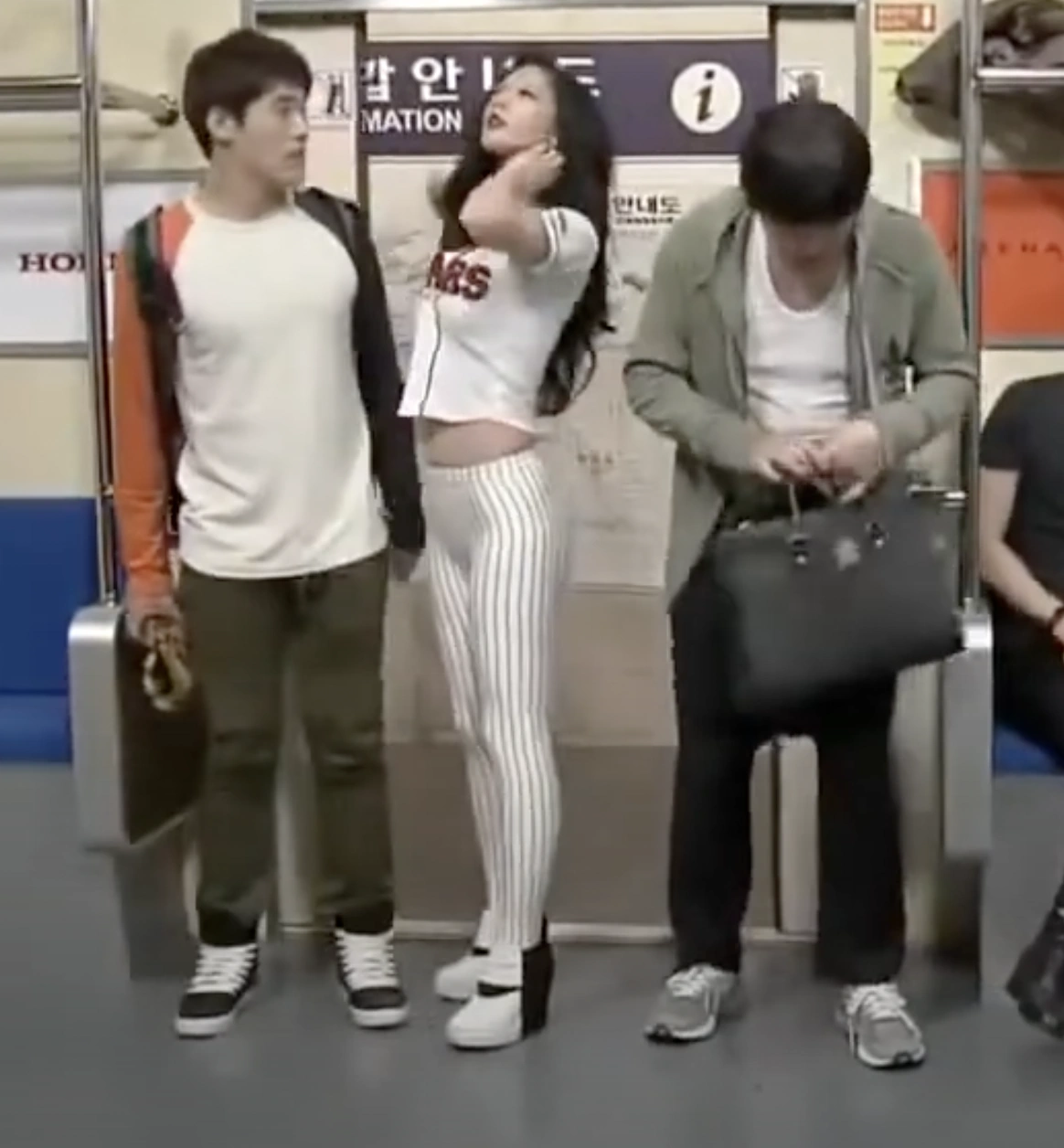 The skit begins with our thief protagonist using his seducer accomplice to flirt/dance/strip on the subway to gain the attention of civilians. While they have their attention turned, he takes money/belongings from them. Towards the end of the skit, Clara Lee's character appears and seduces the protagonist with a series of beguiling moves. Then, she sashays and leaves the subway.