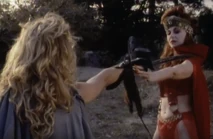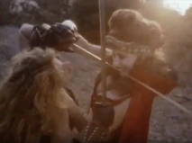 The movie starts out with Corva arriving at the tent of a sleeping Fiona (Diana Frank), her niece, and daughter of Neema. Alongside Fiona's body is the sword that she wishes to obtain. When her sidekick Seamus attempts to take the sword, his hand is cut off by a sort of forcefield. Corva turns off the force field, takes the sword, and has her bodyguard Bolt, take Fiona into captivity. Now Corva controls both swords and is holding her niece hostage.