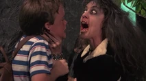 When Joshua discovers the truth about Nilbog and how the inhapitants are not human, she tries to kill him. Joshua escapes and warns his family, but she is able to kill two of his sister's boyfriend's friends. Creedence transforms into a sexy beautiful young seductress with large cleavage and a low cut skirt, revealing black panties. She attempts to trick Joshua into letting her in so she can kill him. She casts a spell on him and leaves him to drown to death in popcorn while she and the other goblins go kill the five remaining humans.