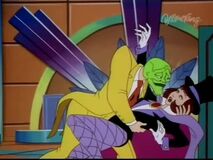 The Mask was able to capture her by removing the weak link in her escapable chains. She was trapped in her straight jacket and arrested.