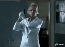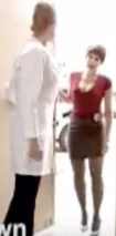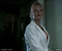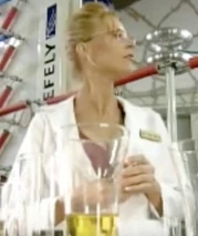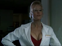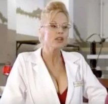 VanHelm has her lab in a warehouse, and she wears a white lab coat buttoned down to reveal her impressive cleavage.