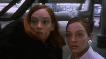 When Emma and Steed infiltrate De Wynter’s hideout, she, dressed in August’s black teddy bear outfit, jumps on Emma from above and tries to kill her in a catfight. However, she is unmasked and it is revealed to the viewer that there is two Emma Peels! When Steed arrives, she evades capture by jumping off the building.