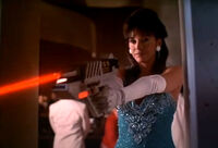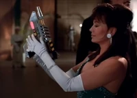 However, after her abusive and humiliating treatment of him, due to his numerous failures, the henchman decides to get some payback and insists that Eve first tell him she's sorry and it won't happen again. With no other choice, she does, and then explains that the gun must be deactivated or else they are going to die. Rather than do as she says, Wrecks runs away to save his own skin with Eve shouting after him that he's fired before the weapon explodes, killing them both.