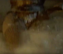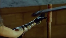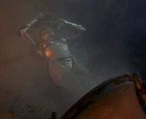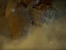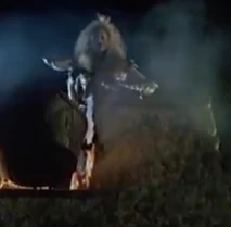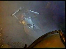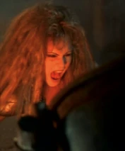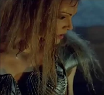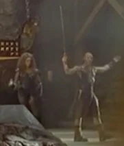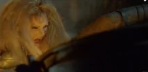 After Morgan Le Fey falls into the boiling cauldron, Flame is then strictly serving Thagnar and his warriors. In a final fight at the castle, Flame is reaching for a wooden handle to release a caldron of boiling hot liquid metal upon some unsuspecting warriors led by Prince Valiant (Stephen Moyer). Princess Ilene sees this and throws a spear at Flame, which knocks her hand away and drops her to the ground. At the same time, her flaming staff drops to the ground and the boiling caldron spills on top of her. All that Flame can do is scream in horror and raise her hands as the boiling liquid engulfs her from her legs and up through the rest of her body. We soon see a satisfied look over the face of Princess Ilene, as she has successfully destroyed the henchbabe. Our last look at Flame is of a petrified statue of the henchwoman, as she lies on the ground, preserved in a state of disbelief.