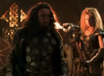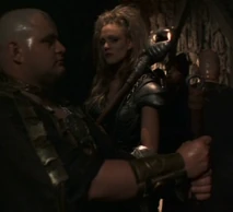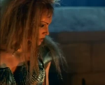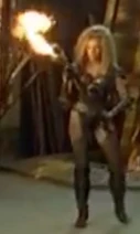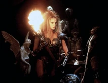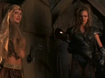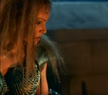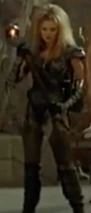 Sligon is later killed by Thagnar, and Thagnar uses Flame to kidnap Princess Ilene (Katherine Heigl). Flame is dressed in a leather bustier, bikini bottom, leather gloves, and mail stockings held up by a garter belt. Her blonde hair is unkept in dredds, and she carries a staff that has a flame coming out of a coiled point.