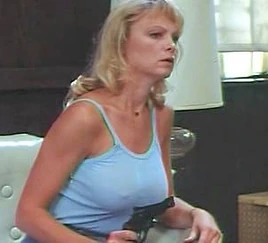 The rich schoolgirls are shocked when it is revealed that their sponsor "Frankie" (Courtney Sands) is one of the kidnappers. The busty, no-nonsense blonde (who wears a revolver in a shoulder holster) is also revealed to be a lesbian. She has had her sights on one of her girls, a timid one who refuses to strip topless for a rah-rah demonstration for the kidnappers. Frankie "rescues" the girl, taking her to the bathroom for a soothing fondling in the bathtub. Unfortunately, Frankie's lesbian seduction is ended when she sees one of the male kidnappers peeping on them.