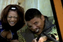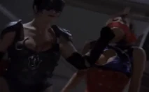 When Black Scorpion (Michelle Lintel) arrives on the scene, she makes quick work of the two henchmen. Giggles begins to laugh, and is asked by Scorpion what she is laughing at. She responds, "I don't know, it's just what I do". Scorpion proceeds to knock out Gangster Prangster, and Giggles runs away.