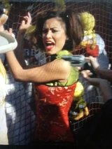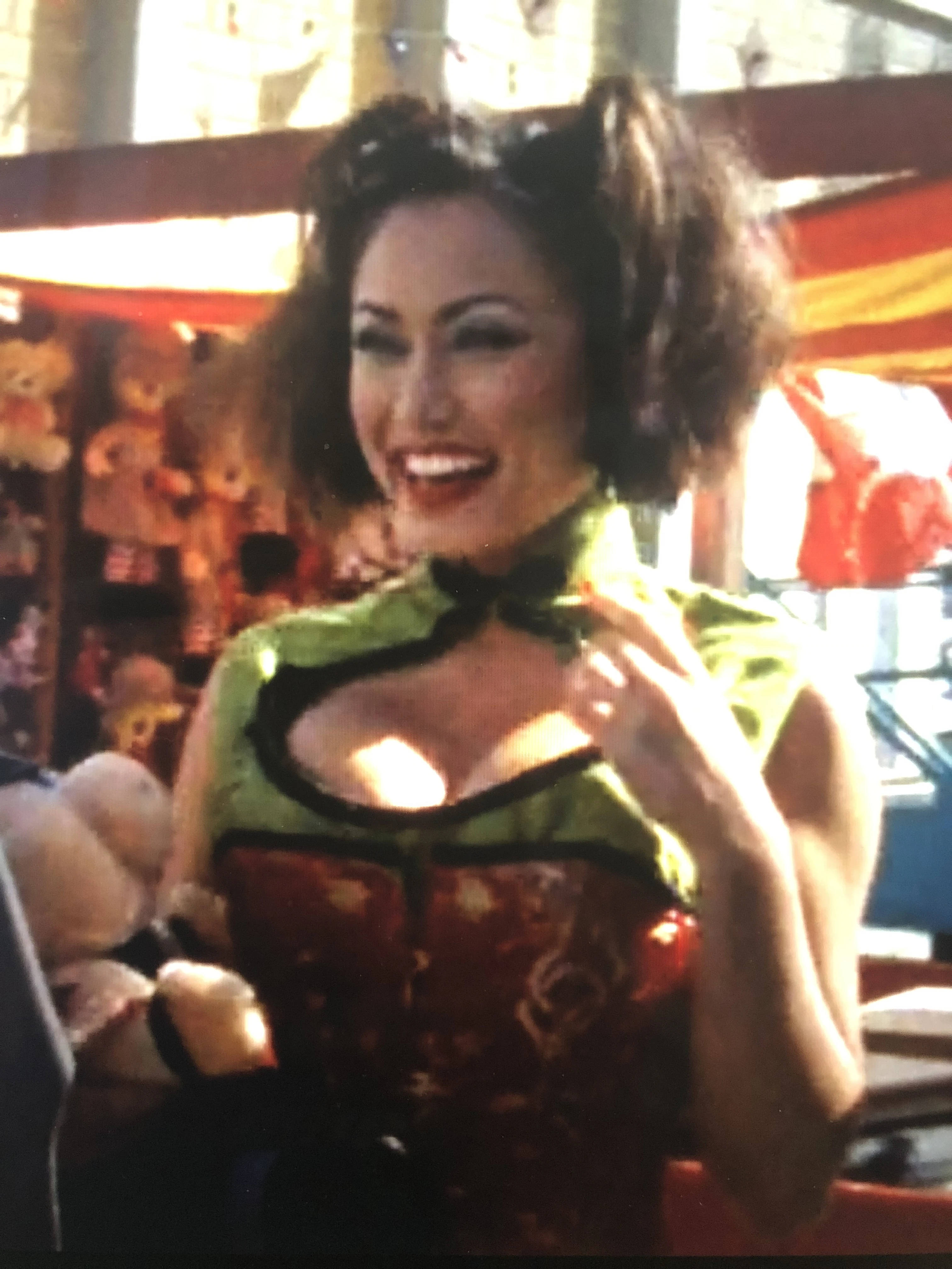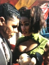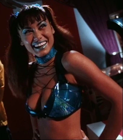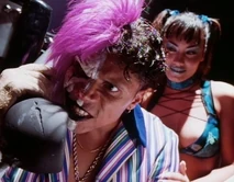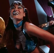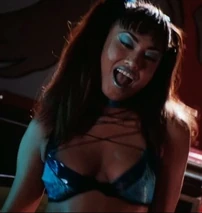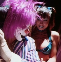 At the beginning of the film, we see Giggles entertaining Gangster Prankster and his two henchmen, Grimace (Carl Banks) and Heckler (David Harris). It is revealed that this is their hideout in the form of a novelty shop, the Playhouse. She is performing an exotic dance up on stage and strips off her top. She is wearing a blue and black bra top and hot pants, with a choker necklace and glass stripper heels. She wears her black hair in pigtails.
