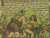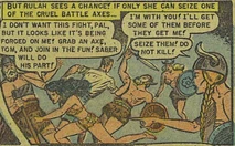 Finally, Rulah and Tom are taken before Gurthe, who for sport has the jungle queen take on her champion, Frieda. After a fierce battle, Rulah is spared Tom is spared in order to marry Gurthe.
