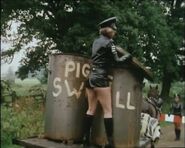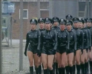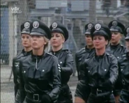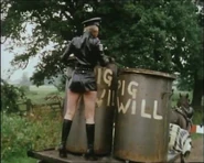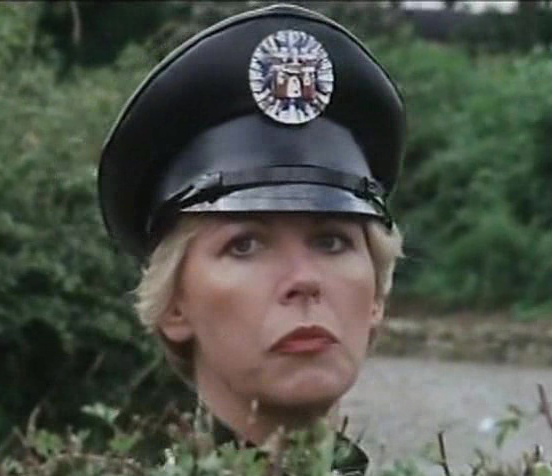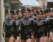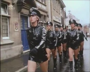 June was a state police Sergeant, played by "Shake and Vac" actress Jenny Logan in a serial called "The Worm that Turned" within the Two Ronnies comedy series. She leads a troop of the PVC clad secret police in a female dominated future. Their uniform consists of PVC police shirt, PVC peaked cap, tight PVC shorts and knee-high high-heeled leather boots. There are lots of scenes of them marching around the city and countryside. June spends most of her time searching for two male fugitives who are trying to escape female rule. She fails in her mission and her fate is unknown. Perhaps the Goering-esque leader, played by an aged Diana Dors had her shot, who knows.