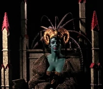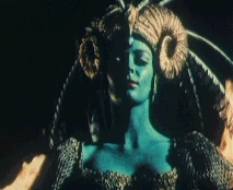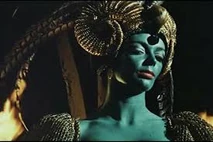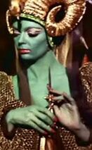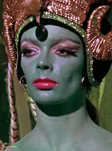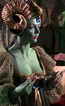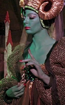Lavinia has green skin, and wears a crown with rams horns and feathers. Surprisingly even the green skin has little effect in covering up her beauty.