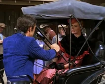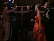 Lavinia plays the damsel in distress right up until the last scene when she holds James up by gunpoint. Artie (who had played a kidnapped victium} has substituted distilled water for the serum [thus he does not age]. Mistakenly thinking a cure has been found, she injects herself with the serum. However As a result, Lavinia ages 50 years right in front of them.