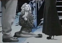 Back at the grange, she overheard Lola in the garden with the Professor, telling him that she would keep the Colonel occupied, while he could open the safe and steal the plans. The Colonel received a phone call from Georgie, warning him that Jane had escaped, and he feared that she might be headed back to the mansion. The Colonel then saw a light coming from the study, and caught the Professor having opened up the safe. However, Lola then entered the room with pistol in hand and took the plans for herself. However, Jane rushed in from behind and the anticipated catfight ensued. After a brief struggle for the gun, Jane was able to land a couple of nice upper cuts to Lola, the last of which made her crumble to the ground. Jane pounced on top of Lola, knocked her gun out of her hands, and now a wrestling match took place. Lola was able to turn the tables on Jane, and while straddling her was about to provide some knockout punches of her own. However, Jane provided a gut blow that quickly made Lola fall backward. Jane attempted to help the Colonel with his struggle with the Professor, but she hit the Colonel with a vase instead. Seeing the plans on the ground, she swiped them up and ran out of the room, jumping over the gorgeous Lola in the process. Jane ran up the stairs, but seeing Private Smith (Olive Mantle) at the top, she quickly reversed course, sliding down the banister. She ended up crashing at the base of the stairs with the Professor and Lola standing over her. Lola told the Professor to get the plans from her, and when she stuffed them down her bra, he hesitated. As a result, Lola reached down grabbed her dress and ripped it from the top up and over her head. Lola then ordered Schmidt, which was the real identification of Private Smith.