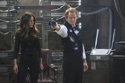 Quaid and Melina find Matthias. While Matthias searches Quaid’s memories, Lori and Cohaagen storm the Resistance base. Cohaagen loads The Fall with his invasion army of robots. Quaid sneaks on board, setting timed explosives throughout the ship while searching for Melina. He frees her as The Fall arrives at the Colony. As they fight the soldiers and Cohaagen, Quaid's explosives detonate. Quaid and Melina jump off before the ship plummets back into the tunnel and explodes underground, killing Cohaagen and destroying his army and The Fall itself – the only way to reach the UFB.