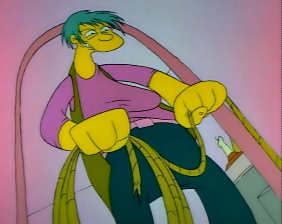 The kids see Botz smiling evilly at them while clutching a rope, and they make their escape. Lisa headed to the kitchen to call the show's hotline, while Bart was hiding in the basement. Botz entered searching for Bart, and while grabbing a jar of homemade pickled beets, Bart attempts to knock out Botz with a bowling ball, only to fail in the attempt. The villainess later caught Lisa on the phone, and she tied up the pair--and covered Bart's mouth with tape. Botz ransacks the Simpsons' closet looking for valuables to steal, when she suddenly sees Maggie (who helped untie her siblings). Botz goes after Maggie, and after hearing the sounds of her pacifier, she entered Maggie's room looking to capture her, only to be knocked out by Bart, who was making the pacifier noises.