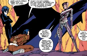 As a spy, Lumiya would become a member of Rogue Squadron and became a trusted agent of the Alliance; secretly, she would sabotage several Rebel missions. Her standing in the Alliance continued to grow after she saved the life of her fellow members of Rogue Squadron from an ambush on Arbra, earning her a promotion to the rank of Captain.