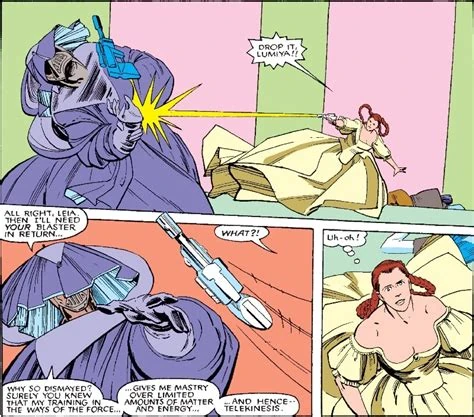 Making use of her Nagai allies, Lumiya attempted to kidnap Leia Organa, Mon Mothma, and several other Rebel leaders. After killing an Alliance scouting party, she learned that neither Leia or Mon Mothma had anything to do with that particular mission; rather, Luke Skywalker himself ordered it. Luke tracked Lumiya to the planet Kinooine, where she had set up her base of operations, and the two dueled. Lumiya was initially successful against Luke, as Luke was not prepared to fight against her lightwhip.