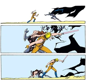 Luke would confront Lumiya a second time, this time wielding a shorter lightsaber with a synthetic red blade, known as a shoto. This time, wielding both his regular lightsaber and the shoto, Luke was victorious. Though rather than finishing Lumiya off, Luke tried to convince her to turn back to the light side, much like Darth Vader had. Lumiya refused and spitefully declared that she would only be satisfied when Luke was killed.