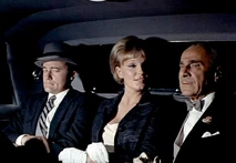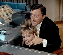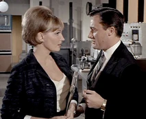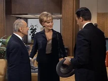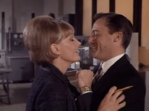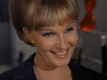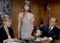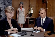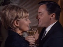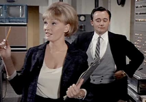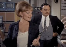 Margo and Napoleon head off to a private room for some champagne and hanky-panky. While putting the moves on Margo, Napoleon secretly sends a signal to headquarters to enable them to track his location. He does this by leaving his communicator open, which means Mr. Waverly and the cute female agent Miss Townsend (Sharyn Hillyer) manning the communications console, whom Napoleon has been having a relationship on the side, have to sit and listen to him getting it on with Margo. Napoleon’s pre-coital small talk involves quoting Shakespeare (“How do I love thee? Let me count the ways”), while back at headquarters, the hapless female communications agent quietly seethes: “He used that same miserable line on me!”