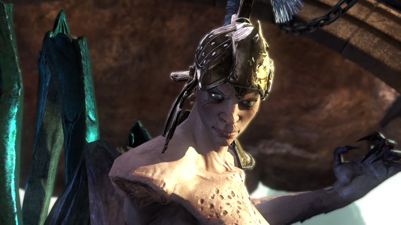 An injured Megaera flees from Kratos, taunting him as she runs on her huge legs. She summons parasites from her chest and they latch on to caged humans in order to transform them into insect-like monsters that are similar to the satyr grunts. The chase continues until they both come to a huge arm of the Hecatonchire. Desperate, Megaera releases another swarm of parasites that burrow into the giant's skin. The arm splits in half to reveal a beastly monster inside. The Fury then leaves the scene as the mutated hand attacks Kratos.