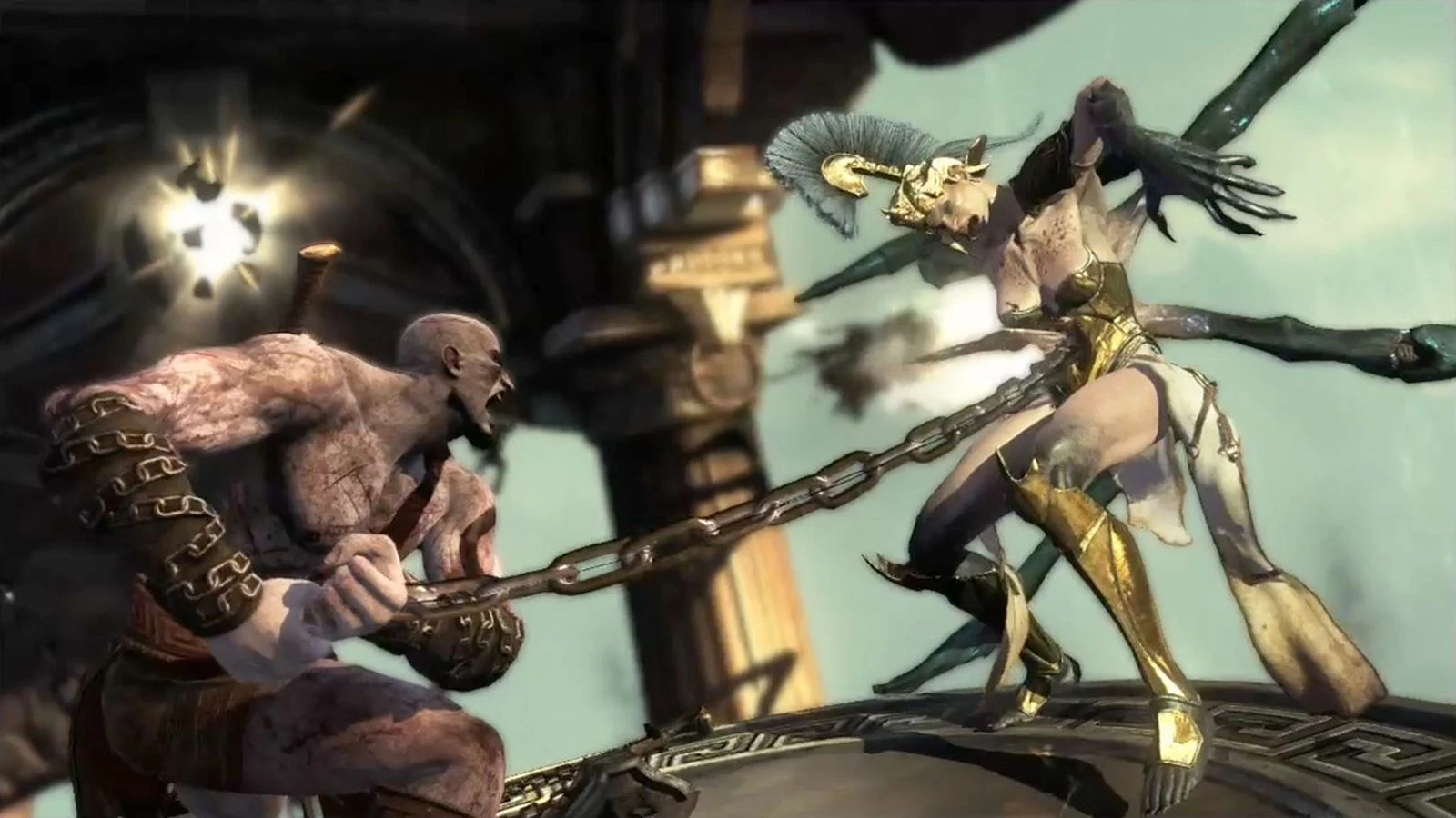During Kratos's journey to Delos (shown in the second flashback of the game), he traverses the Statue of Apollo and eventually comes across an illusion of Sparta put together by the Furies Megaera and Tisiphone. As Kratos fights illusional Spartans, Megaera also attacks and is able to stand against Kratos quite well, causing powerful shockwaves with her attacks. After a long brutal fight between the two, Megaera is slammed through the wall and her mask gets damaged she immediately counters by choking Kratos, who saves himself by tearing off Megaera's arm. The illusion then ceases as the injured Megaera and infuriated Tisiphone (and her pet Daimon) attack Kratos head on. During the battle, Megaera is harpooned with the Blades of Chaos and tossed off the Statue of Apollo. Kratos then 'kills' Tisiphone, but it turns out the one he killed was just another illusion. Kratos is then subdued by the third Fury, Alecto.