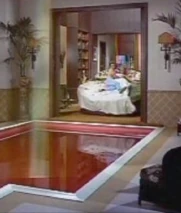 As established in the first movie, Matt sleeps in a large round bed that has a button that causes the bed to move across the floor to the edge of his swimming pool-sized bathtub. The bed then tilts and he slides in. On most morning Lovey is in the pool to help him scrub up and start the day with a bang.