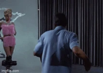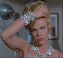 She attempts to flirt with him, but Helm is tired and wants to take a break. As Helm leaves the studio telling her to leave her costume before he leaves. After Helm is gone Miss January pulls out some sort of control device from under her bouffant hairdo and turns it on.