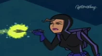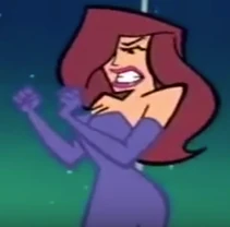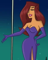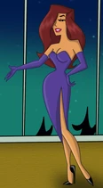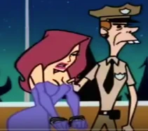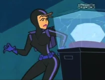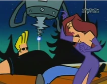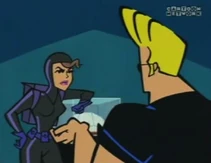 She was surprised by Johnny Bravo, who was accidentally locked in the museum over night, then clumsily swallowed the jewel she wanted to steal. She took him home to cut open his stomach with a laser device, but before she could do so, Johnny destroyed her entire collection. After she restrains Johnny, Mama Bravo and the the museum guard storm her home to arrest her and rescue Johnny. She attempted to escape, swearing revenge on Johnny, but he tackled her to stop her from leaving, believing they were in love. After that she was arrested and incarcerated.