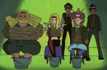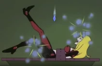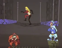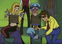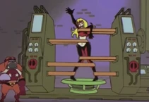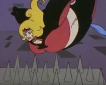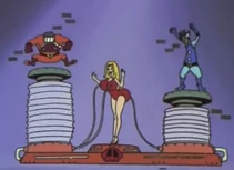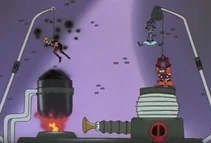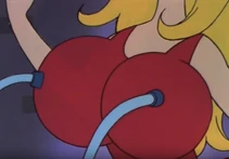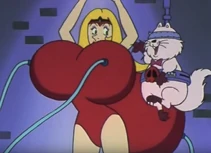After the initial humiliation/explosion the antagonists are seen standing before the "forfeit machine." The forfeit machine chooses the antagonist that was most to blame for the groups failure and punishes that member. Often times Muujo is chosen. Among her punishments for failure are to have her body inflated, forced labor, spanking or other ridiculous punishments involving spikes and robots.