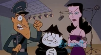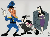 Natasha was the girlfriend and accomplice of the main antagonist Boris Badenov. Boris and Natasha live in Pottslyvania where everybody there is a spy. Boris and Nasha are always defeated by Rocky and Bullwinke or as they call them "Moose and Squirrel". Boris and Nasha's superiors have been Mr. Big, a short man who uses a flashlight to make his shadow big so he will seem threatening and Fearless Leader. Boris and Nasha are also master of disguises. She has a temper against Boris and Fearless Leader when their plans go astry. Her anger increases when trying to eliminate Rock and Bullwinkle. According to Wikipedia: "According to the Rialto Theater's Moosebill for "Downhill: The Musical" (a special table of contents insert created for the DVD box set Rocky and Bullwinkle & Friends, The Third Season), Natasha is supposedly the only child of Axis Sally and Count Dracula. A former Miss Transylvania, she was expelled from college for subversive activities at a local cemetery. She traveled from Transylvania to the United States at the age of 19, landing in New York, where she spent two years posing for cartoonist Charles Addams, and as the party girl who pops out of the big cake at embalmers' stag parties.