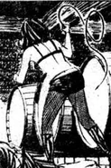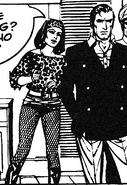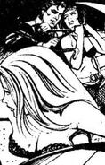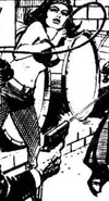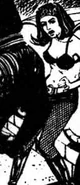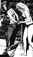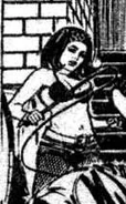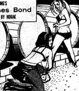 Olga is a good looking white woman of about 30 with shoulder length straight dark hair. She wears a bikini type bottom with fishnets and black boots. She is is a cold blooded villainess with no redeeming features apparent. She is a ruthless sadist. When Baron Sharck has Bond and Gretta captive, the villains try to extract information about the whereabouts of the box from Bond. They strip and tie up Gretta. Olga, relishing the situation, holds flourishes a whip, with which, says the Baron, she will strip the skin from Gretta's back if Bond doesn't talk. She is armed with an automatic handgun and a whip.