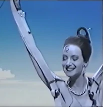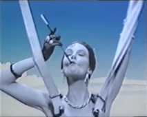 As the plane is descending down in a deep spiral, Pola is soon seen parachuting down to safety. She yells out "happy landing" and then calmly smokes a cigarette.