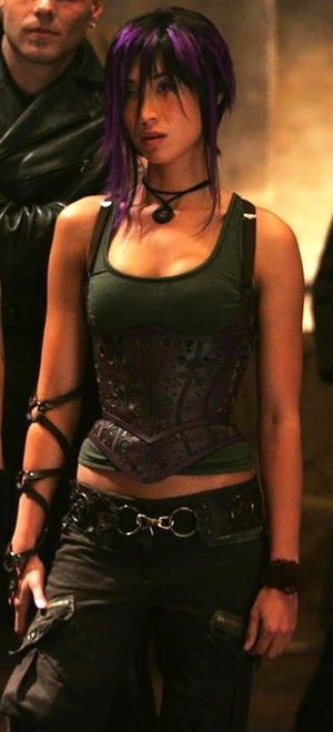 Her attire included a brown tank top strapped together with a brown leather corset. She wore dark cargo pants with a waist belt. On her left arm she wore a bracelet while on her right arm she wore a leather strap covering half of her arm. Around her neck, she wore a black necklace. In her second appearance in the film, she wore a dark jacket over her tank top.