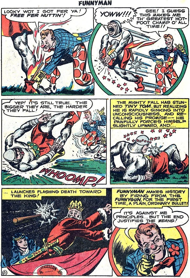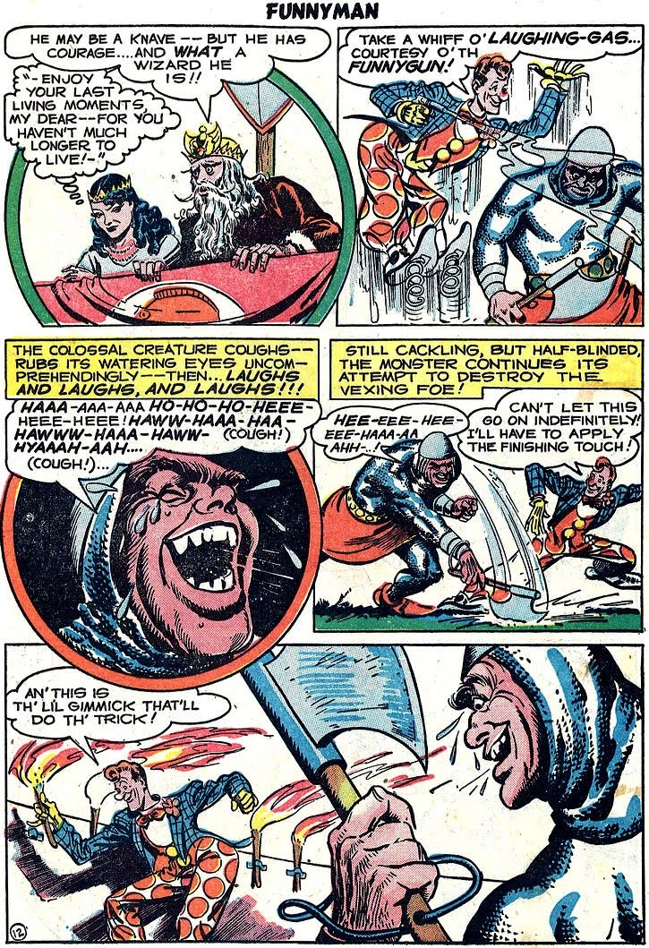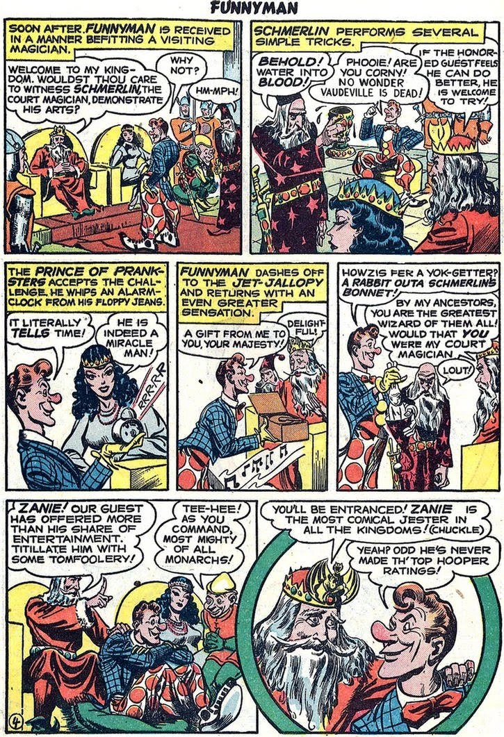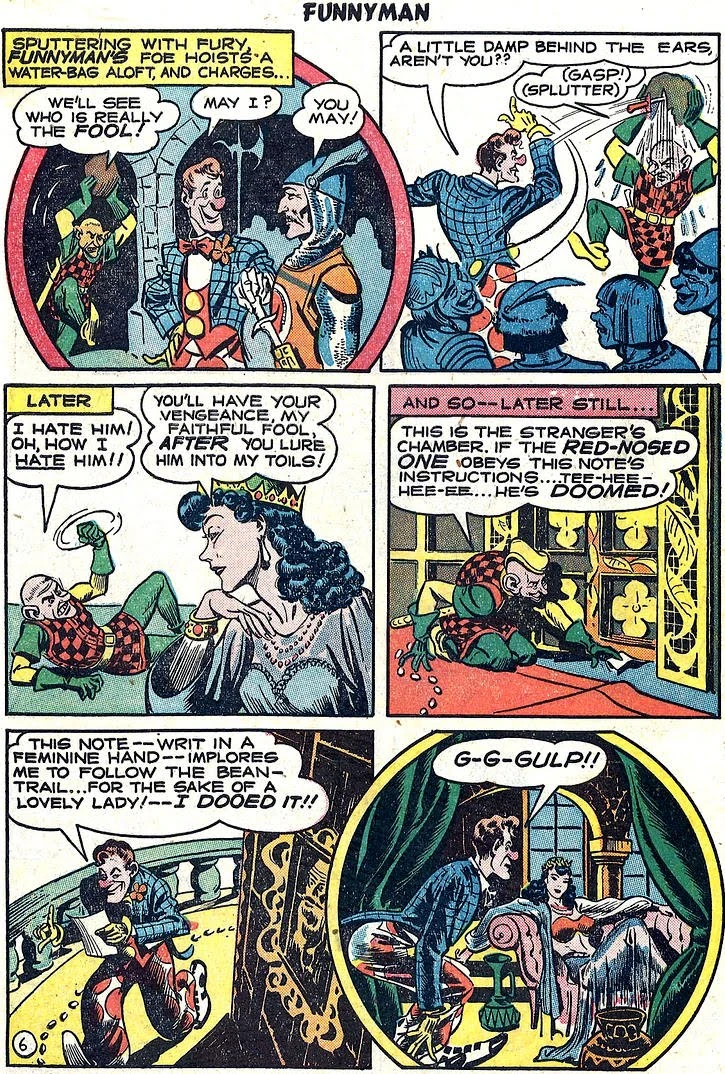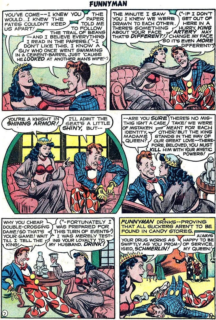 Queen Hotcha is a nasty villainess in Siegel and Shuster's "Funnyman #4". In this Golden-Age-Comic, an annoying hero saves the court of King Arthur! The Evil is presented by the Queen and wife of the King herself!