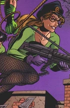 Query wears a costume made up of a leotard-like clothing with black fishnet stockings and a big question mark logo over her chest. Her suits are either green, like that of the Riddler, or purple to contrast with it. Sometimes, Query wears a police cap. Query has Blonde or light brunette hair, and blue eyes. Query was well-trained with firearms and boasts impressive combat skills. Her skills in combat, weapons and crimes make Query a very dangerous opponent. She prefers light weapons such as shotguns, but has also operated M60 light machineguns. She also carries a slingshot from her hip, and has a handgun.