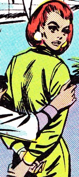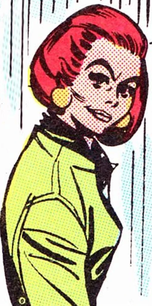 Raven Red is a sophisticated looking, tall white woman of about 30 with red back combed short, bobbed hair. She is beautiful, but predatory and devious looking. She wears a light green jumpsuit /catsuit with green boots in The Powder Puff Derby Caper and a dark green jumpsuit /catsuit with boots in The Menace of the Feathered Warriors.