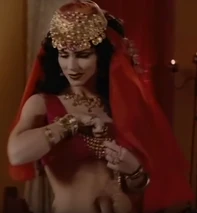 Rumina infiltrates the palace as a dancer, entertaining Sinbad's crew. When she and Sinbad go off alone, she shakes a magical dust on him, then snatches the medallion he was given to wear by the Sultan. The medallion gives the wearer diplomatic immunity in Basra, and access to a treasure room. The magical dust shrinks Sinbad to only inches tall, and then Rumina plucks him up, carrying him up, and carrying him out in her cleavage. Trapping Sinbad in a bottle in her bedroom, she has her cat guard him.