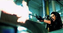 At the end of the film, there is a shootout where many of the girls are killed. Sacha is firing her rifle from an elevated position. The gas line pipe is shot above her head, and she has that moment of impending doom, when she knows all is over for her. She screams, and the flames from the explosion begin to engulf her body.