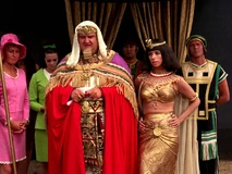 King Tut (Victor Buono) returns to Gotham, supposedly reformed and sets up a tent on 6th and Albert streets as a public crime predictor. After three crimes Tut predicts become reality, Batman (Adam West) and Robin (Richard Grayson) pay him a visit. Tut is performing a ritual involving calling the evil gods to make his next prediction. We see the lovely Shirley, who is his current Queen fanning him with a large red ostrich feather as he stands on his throne. After leaving, Tut reveals that if he predicts enough crimes that come true, the police will trust him, and then he’ll pull a nasty one.